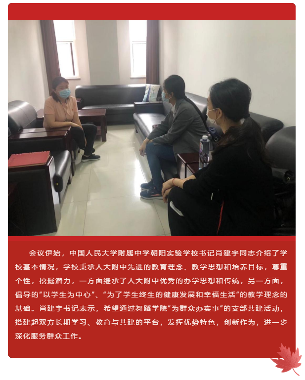 为庆祝中国共产党成立100周年、线上赌博 建校80周年,进一步落实“学党史 悟思想 办实事 开新局”的总体要求,有力推动“我为群众办实事”实践活动的走深走实,线上赌博 学生第一党支部组织开展了“我为群众办实事”支部共建活动。线上赌博 党团学工办公室主任李慧娟与学生第一党支部书记宋昕怡实地走访中国人民大学附属中学朝阳实验线上赌博 调研支部相关情况。