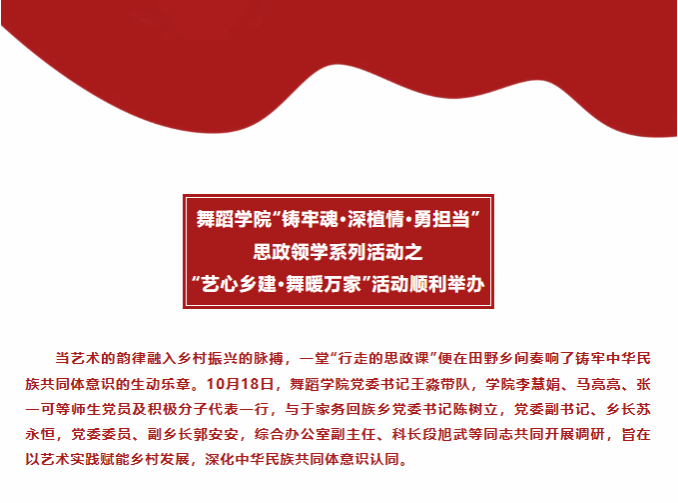 此次于家务之行,是一次深刻的启迪与温暖的奔赴。师生们亲身体验了科技兴农、乡村治理与文化传承的成就,进一步坚定了文化自信与责任担当。大家表示,必将把这份来自乡土的滋养与“铸牢”的深刻感悟融入未来艺术创作,用舞蹈讲好温暖而有力的中国故事,为赋能乡村振兴、铸牢中华民族共同体意识贡献智慧与力量。