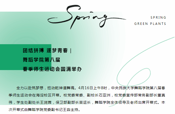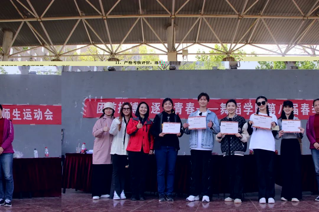 为本届运动会的圆满举办付出辛勤努力的裁判员、工作人员、志愿者表示感谢,并向取得优异成绩的运动员、班级团体表示祝贺。运动员们展现了精湛的竞技水平和良好的精神风貌,诠释了舞院学子奋发向上的青春年华。老师们的加入,更进一步加强了师生之间的沟通与交流。希望同学们不断努力,敢于拼搏,勇于突破,彰显意气风发的青春风貌,继续抒写舞院的华丽篇章!